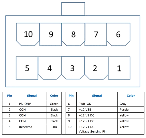 新的10针主供电接口针脚定义如下,其中第8、9、10针用于+12V V1 DC供电输出和电压感应,第7针用于+12VSB,同时第1、5针采用防呆设计。