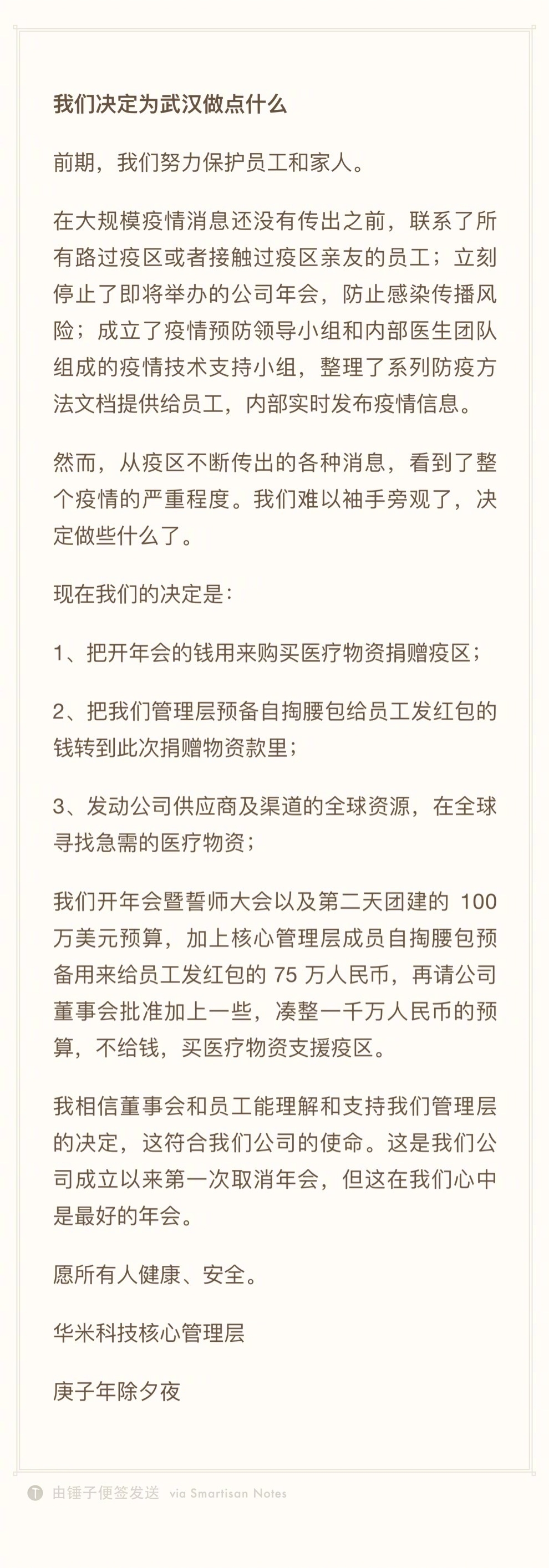 华米科技原本计划在2020年春节后召开誓师大会及团建,预算为100万美元,此外,核心管理层成员原本计划自掏腰包为员工发红包的75万元,另外会再请董事会批准,凑够1000万元整进行医疗物资采购。