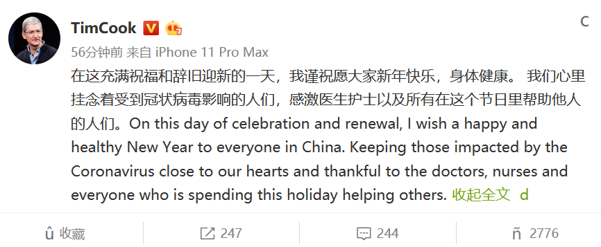 苹果公司CEO Tim Cook一小时前在微博发表新年贺词,在全国各地采取措施严防新型冠状病毒感染的肺炎疫情蔓延的当下,他还向抗击疫情的一线医务人员致意。库克表示,苹果公司成员挂念着受到冠状病毒影响的人们,并且感激医生护士以及所有在这个节日里帮助他人的人们。