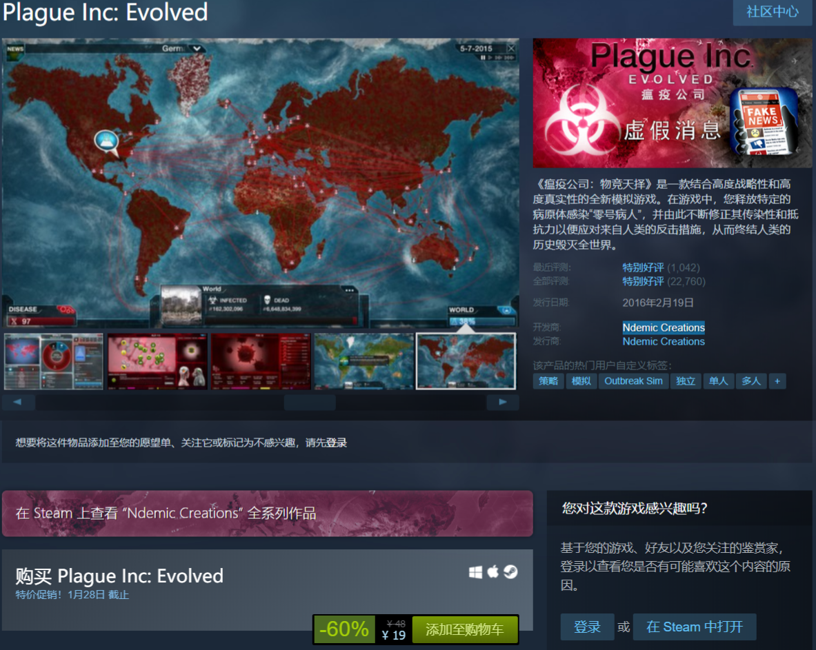 《瘟疫公司》目前正在 Steam 平台优惠价19元(原价48元,优惠60%)发售中,喜欢的玩家可以前往 Steam 平台进行购买。