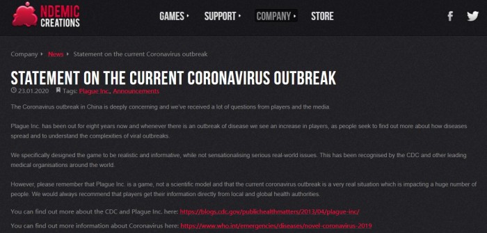 随着新型冠状病毒在国内的爆发,策略模拟游戏《瘟疫公司》也登上了 Steam 平台热销榜,近日《瘟疫公司》在其官方网站发布了一则声明表示:这只是一款游戏,请各位玩家从当地以及全球卫生部门获取信息。