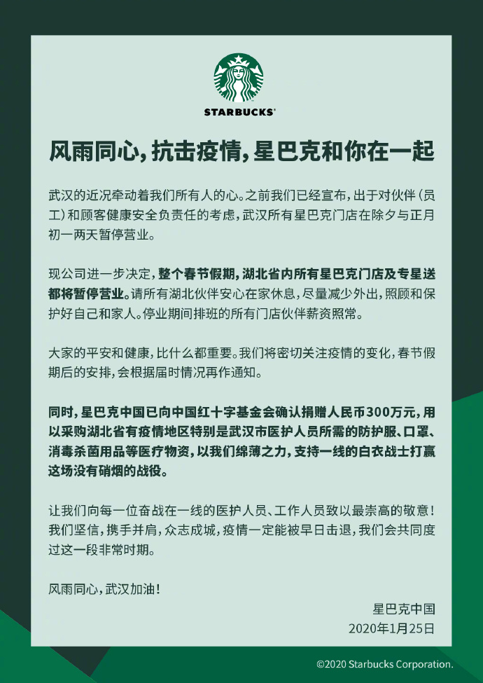 风雨同心,抗击疫情,星巴克和你在一起。出于对伙伴(员工)和顾客健康安全的考虑,整个春节假期湖北省内所有星巴克门店和专星送都将暂停营业。星巴克中国已向中国红十字基金会确认捐赠人民币300万元,用以采购湖北省有疫情地区特别是武汉市医护人员所需的防护服、口罩、消毒杀菌用品等医疗物资,以我们绵薄之力,支持一线的白衣战士打赢这场没有硝烟的战役。