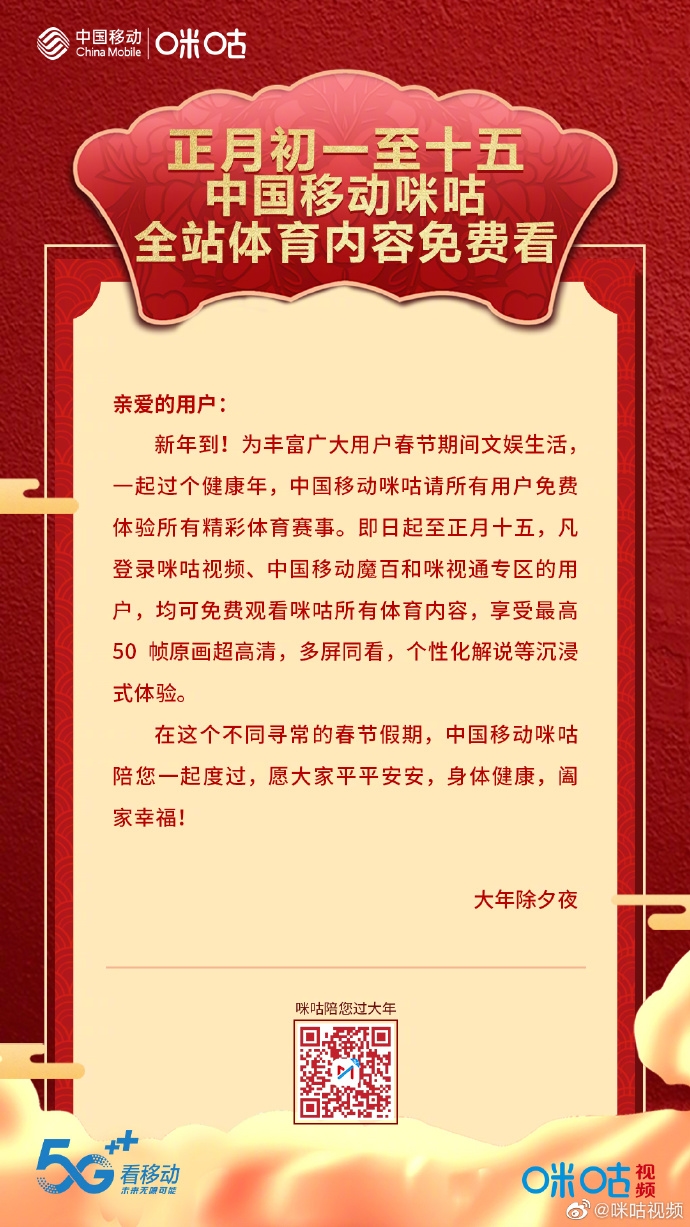 中国移动旗下咪咕视频在近日宣布,即日起至正月十五(2月8日),咪咕全站所有体育内容免费播放。据悉,即日起至正月十五,凡登录咪咕视频、中国移动魔百和咪视通专区的用户,均可免费观看咪咕所有体育内容,可以享受到最高50帧原画超高清画质,并且支持多屏同看,个性化解说等功能。