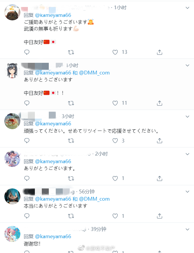 在推文下方,不少网友也向亀山和DMM公司表示感谢,为武汉祈福,也有人留言“中日友好”。