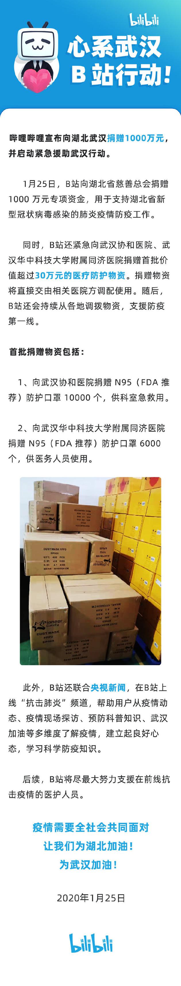 1月26日早间消息,哔哩哔哩(以下简称“B站”)宣布向武汉捐赠1000万元,并启动紧急援助武汉行动。除了向湖北省慈善总会捐赠1000万元专项资金,B站还向武汉多家医院捐赠超过30万元的医疗防护物资。此后,B站还将从全国各地调运物资,支援防疫第一线。
