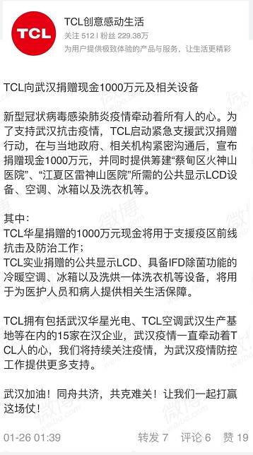 TCL向武汉捐赠现金1000万元及相关设备