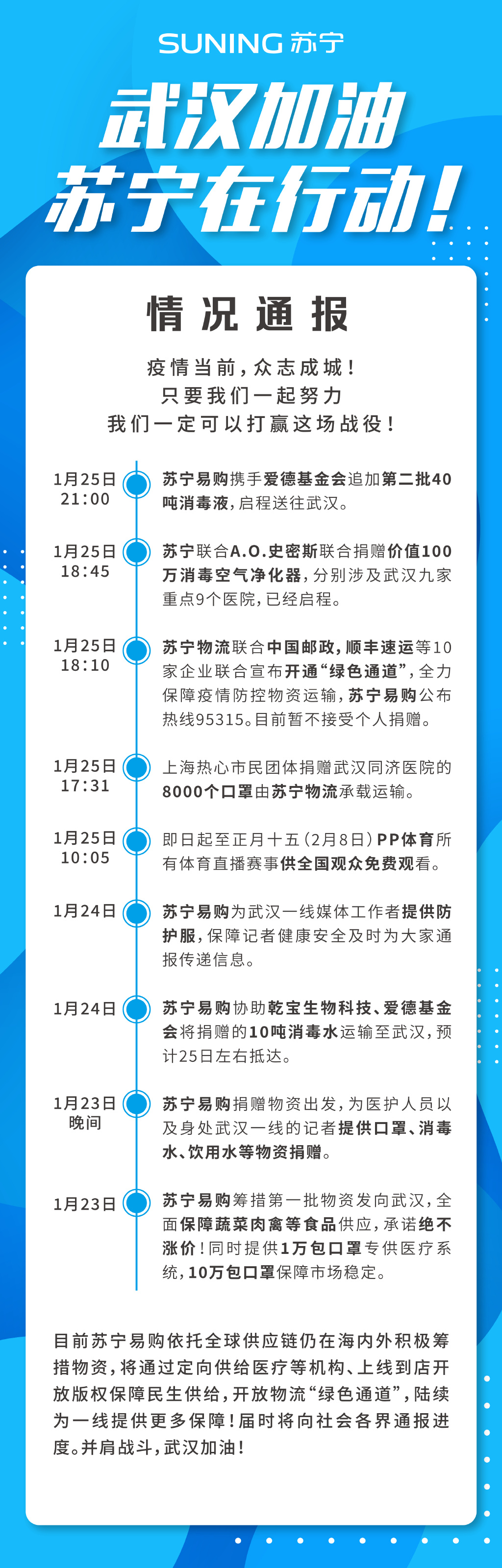苏宁相关负责人表示,苏宁将继续与武汉政府以及医疗系统保持紧密沟通,为武汉疫情防控工作提供我们力之所能的各项帮助,以解疫区燃眉之急。