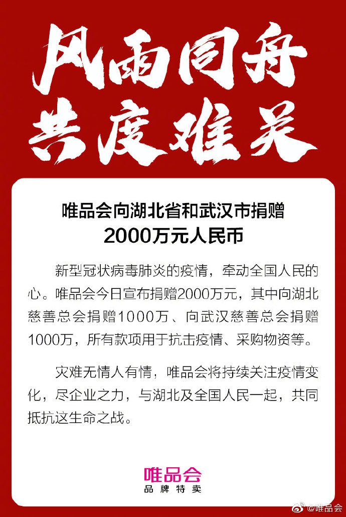 新型冠状病毒肺炎的疫情,牵动全国人民的心。唯品会今日宣布捐赠2000万元,其中向湖北慈善总会捐赠1000万、向武汉慈善总会捐赠1000万,所有款项用于抗击疫情、采购物资等。灾难无情人有情,唯品会将持续关注疫情变化,尽企业之力,与湖北及全国人民一起,共同抵抗这生命之战。