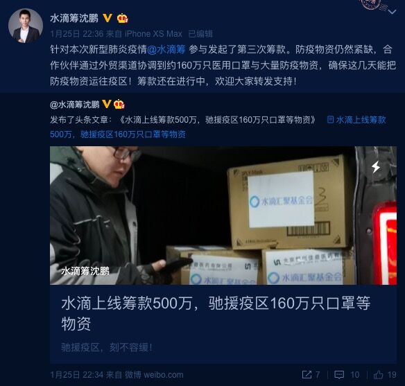 1月26日消息,水滴公司对外宣布,水滴公益联合水滴汇聚基金会发起的“防疫前线,水滴助力”募捐项目,已在一夜之间筹满500万元。水滴公司创始人兼CEO沈鹏表态,将尽快把之前就已经线下协调成功的160万口罩和其他防疫物资运往疫区一线,但目前还有很多医用物资缺口,欢迎大家提供线索。