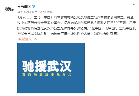 1月26日消息,宝马集团官方宣布,宝马中国及华晨宝马汽车有限公司决定,将通过中华慈善总会宝马爱心基金,向湖北省慈善总会捐款人民币500万元,用于抗击湖北省特别是武汉市新型冠状病毒肺炎疫情。
