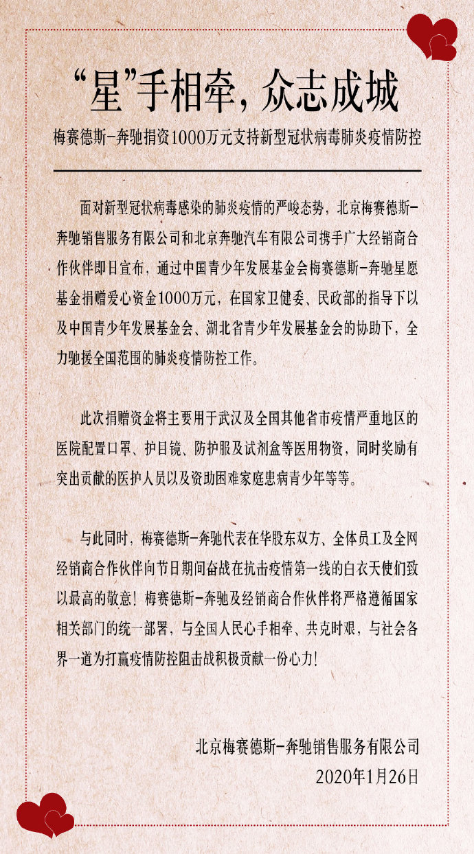 1月26日,北京梅赛德斯-奔驰销售服务有限公司和北京奔驰汽车有限公司携手广大经销商合作伙伴宣布,即日通过中国青少年发展基金会梅赛德斯-奔驰星愿基金捐赠爱心资金1000万元,在国家卫健委、民政部的指导下以及中国青少年发展基金会、湖北省青少年发展基金会的协助下,全力驰援全国范围的肺炎疫情防控工作。