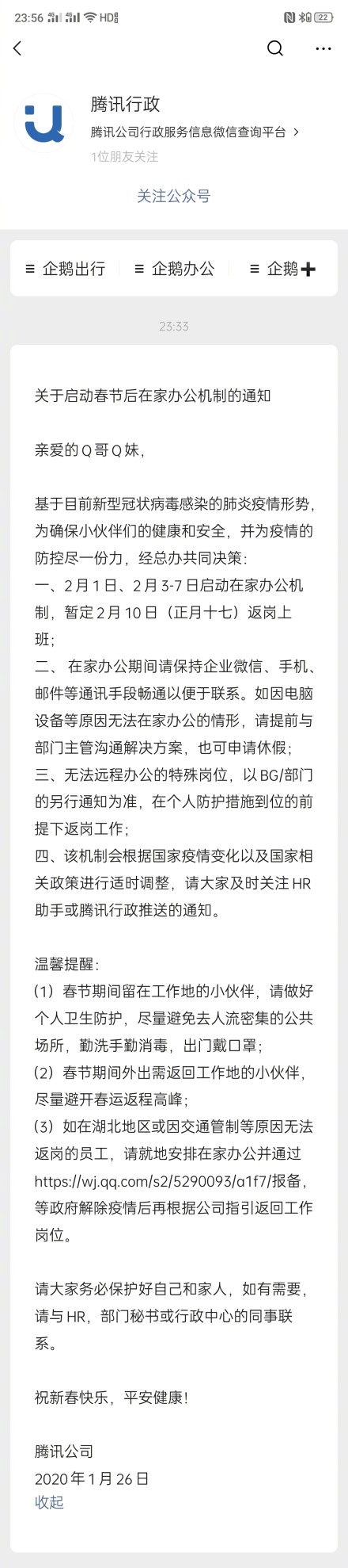 1月27日凌晨消息,腾讯向员工发布通知,启动春节后在家办公机制。腾讯通知表示,基于目前新型冠状病毒感染的肺炎疫情形势,为确保员工健康和安全,并为疫情的防控尽一份力,经总办共同决策,2月1日、2月3-7日启动在家办公机制,暂定2月10日(正月十七)返岗上班。