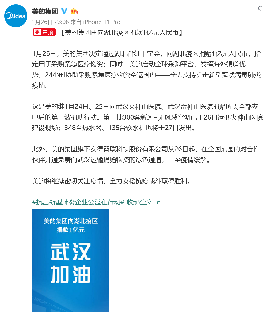 美的集团决定通过湖北省红十字会,向湖北疫区捐赠1亿元人民币,指定用于采购紧急医疗物资。这是美的继1月24日、25日向武汉火神山医院、武汉雷神山医院捐赠所需全部家电后的第三波捐助行动。第一批300套新风+无风感空调已于26日运抵火神山医院建设现场;348台热水器、135台饮水机也将于27日发出。