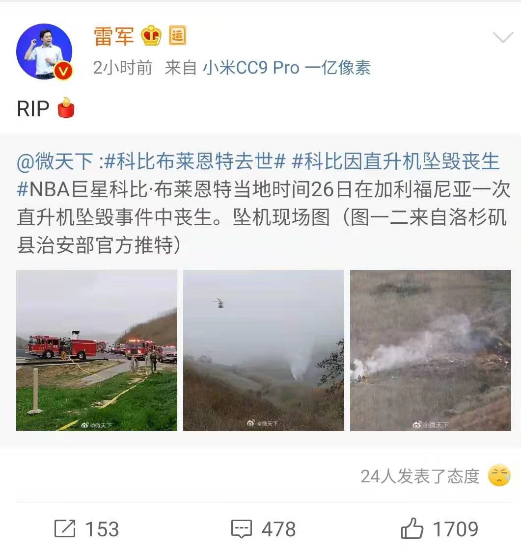 小米集团创始人雷军今天也在微博上发文悼念科比,希望逝者安息(RIP)。