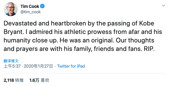 美国当地时间26日,NBA传奇球星科比·布莱恩特(Kobe Bryant)在直升机事故中遇难,享年41岁,令世界震惊。得知这一消息后,科技界知名人士纷纷发布悼念科比。 苹果公司CEO蒂姆·库克(Tim Cook)刚刚在Twitter上发文称:“科比遇难的消息令人震惊和心碎。他那超凡的运动能力和人性远近皆知,令我钦佩。科比独一无二。我们的思绪和祈祷之情与他的家人、朋友以及粉丝同在。愿你安息。”