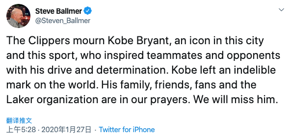 微软公司前CEO、现洛杉矶快船队老板史蒂夫·鲍尔默(Steven_Ballmer)发布推文称:“快船队悼念科比,他是这种城市和这项运动的偶像,他用动力和决心鼓舞着队友和对手。科比在世界上留下了不可磨灭的印记。我们为他的家人、好友、粉丝以及湖人队祈祷。我们会想念他的。”