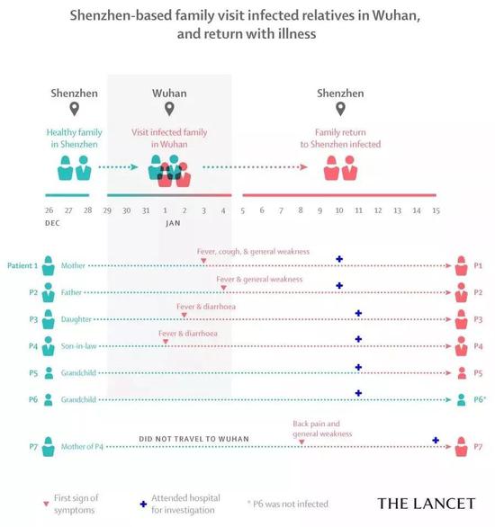 第一名患者( 65 岁,女性)于 2019 年 12 月 29 日在武汉一家医院探望了一名 1 岁的高热性肺炎亲属后五天出现症状。回家后,她于 2020 年 1 月 10 日被香港大学深圳医院(HKU-SZH)收治入院,她的丈夫(66 岁)也发病并同时入院(上图)。