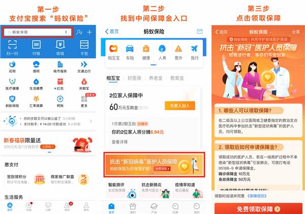 今天开始,医护人员在支付宝APP内搜索“蚂蚁保险”,进入页面就能认领保障,家属、同事代领功能也在加紧开发中。如果后续需申请保障金,可在支付宝内完成。