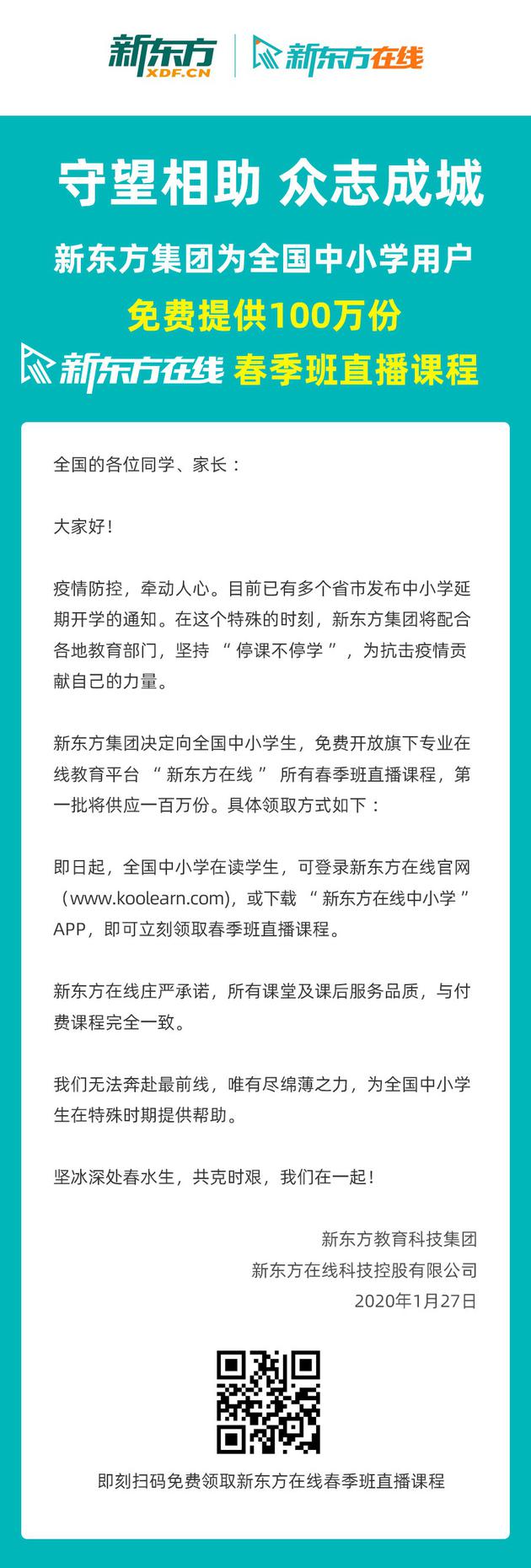 新型肺炎疫情牵动全国关注,新东方和旗下在线教育平台新东方在线联合宣布,向全国中小学生,免费开放新东方在线所有春季班直播课程,第一批将供应一百万份。公告提到,目前已有多个省市发布中小学延期开学的通知。在这个特殊的时刻,新东方集团将配合各地教育部门,坚持“停课不停学”,为抗击疫情贡献自己的力量。
