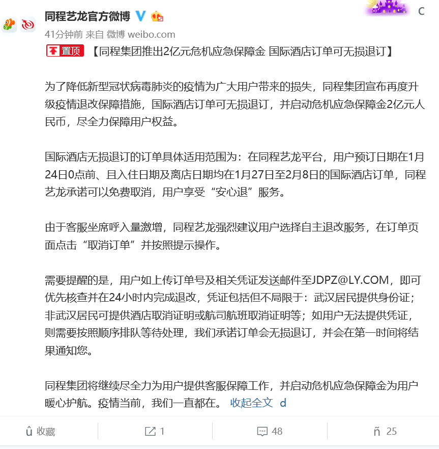 为了降低新型冠状病毒肺炎的疫情为广大用户带来的损失,同程集团宣布再度升级疫情退改保障措施,国际酒店订单可无损退订,并启动危机应急保障金2亿元人民币,尽全力保障用户权益。