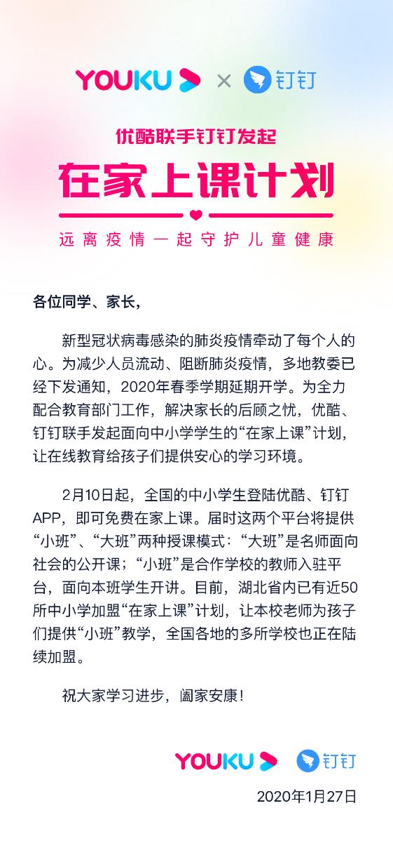 为减少人员流动、阻断肺炎疫情,湖北、北京、上海、天津、河南、贵州等多地教委已经下发通知,2020年春季学期延期开学。1月27日下午,阿里巴巴集团旗下优酷、钉钉宣布联手发起“在家上课”计划。2月10日起,全国的中小学生登陆优酷、钉钉APP,即可免费在家上课。