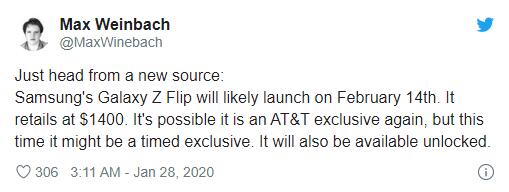 对于折叠屏智能机的粉丝来说,这里有个好消息。因为传说中的三星 Galaxy Z Flip,有望早至 2 月 14 日开售。2 月 11 日,该公司还有望在 Unpacked 活动上发布 Galaxy S20 系列智能机。XDA-Developer 的 Max Weinbach 补充道:Galaxy Z Flip 的售价可能比预期要高一些,达到 1400 美元(9710 RMB)。