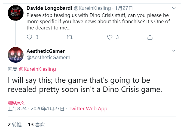 曾准确泄露了《生化危机3:重制版》首批细节的内部人士AestheticGamer最近发推称Capcom一个新作马上就要公布。AestheticGamer起初在Twitter上po出了一张图片,配文是“提醒一下所有的人类曾经都是恐龙”,鉴于Capcom拥有《恐龙危机》这个IP,所以他的这个推文导致很多玩家以为Capcom很快会公布一个新的《恐龙危机》游戏。