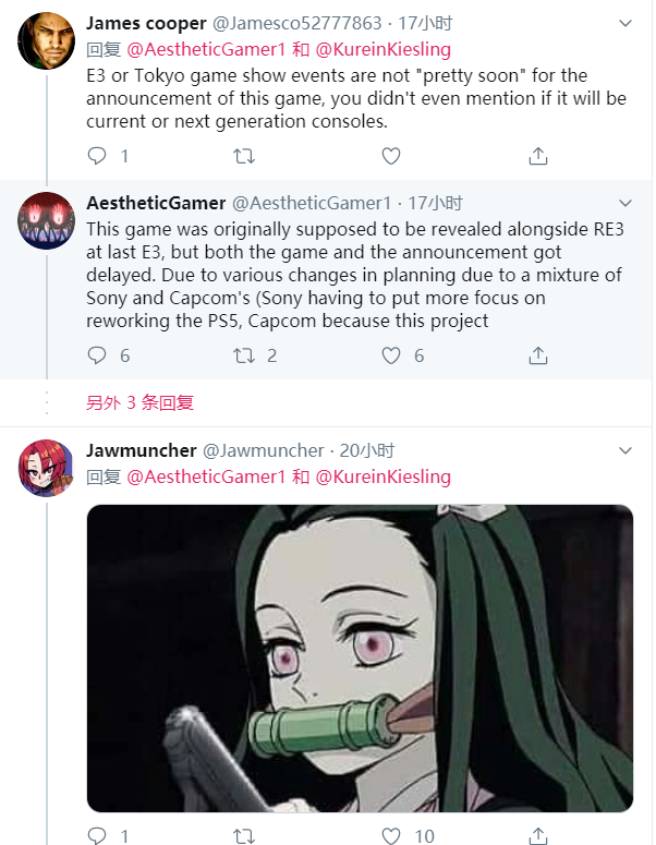 “需要更多的时间,我觉得(不是太肯定)他们正在让这款游戏变成跨世代作品,不过次世代版本已经被延期。我不知道Capcom具体什么时候公布这个游戏,当他们做决定时我又没在他们的办公室里。但按照之前的计划,这个游戏应该在去年公布,今年发售,随着它的延期,我觉得这款新作很快要公布了。”