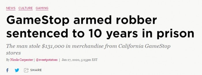 根据美国检察官办公室今天(1月28日)发布的新闻稿,一名28岁的加利福尼亚男子因持枪抢劫加利福尼亚的GameStop实体商店而被判处10年监禁。