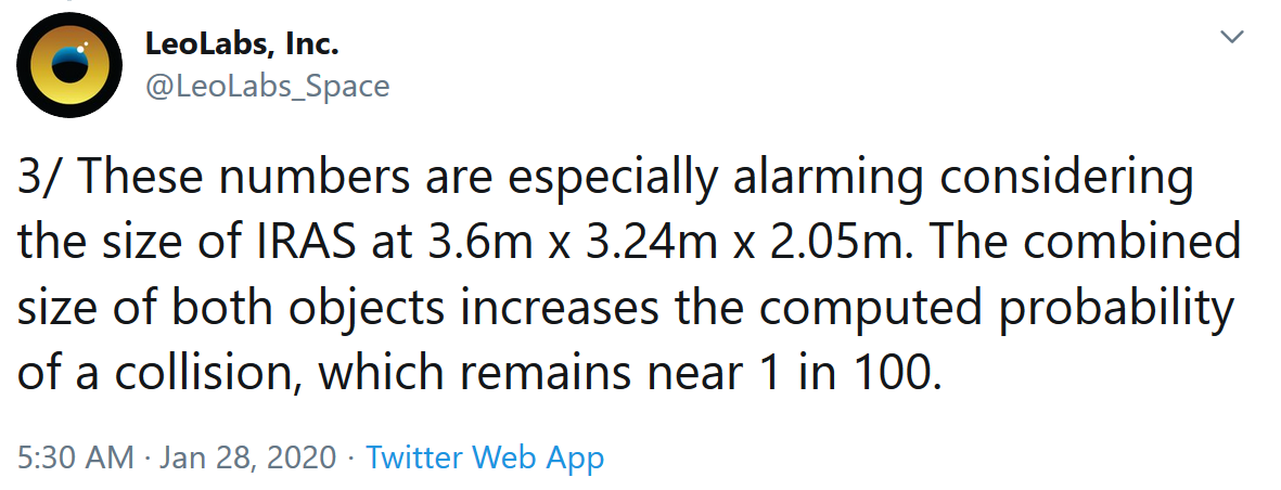 这家公司表示,它正在监测这一方法,另外其最新指标显示预测的脱靶距离在15-30米之间。LeoLabs指出,考虑到IRAS的大小(3.6米×3.24米×2.05米),在某种程度上增加了碰撞的几率,约为1/100。