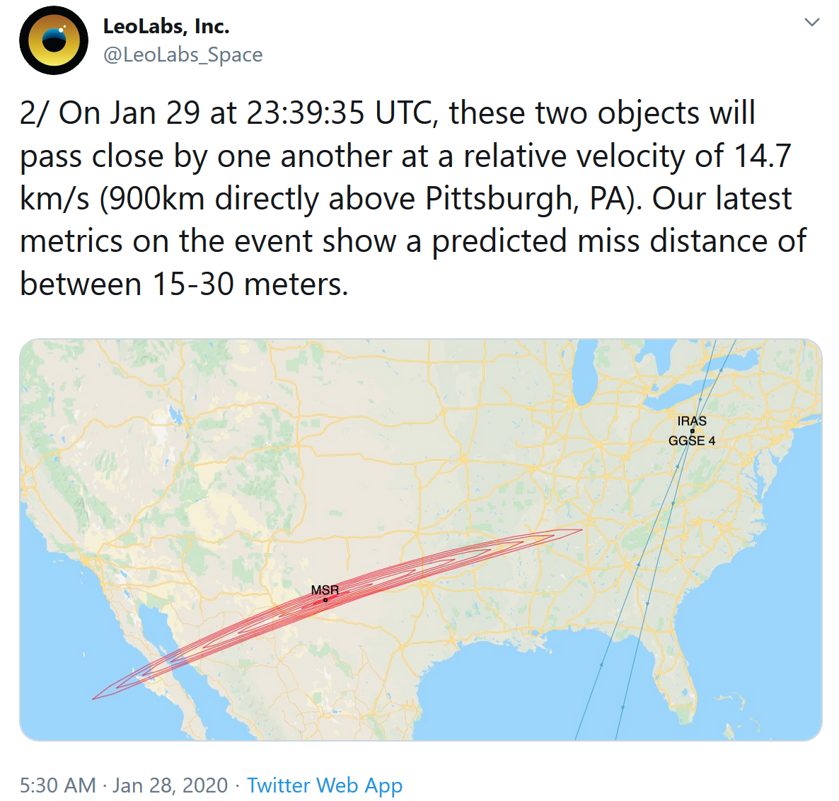 据外媒报道,据太空碎片跟踪系统LeoLabs称,当地时间周三,两颗卫星可能会在匹兹堡上空相撞。LeoLabs周一在Twitter上发文称,于1983年发射的退役太空望远镜IRAS(13777)和于1967年发射的美国实验有效载荷GGSE-4(2828)将以14.7 km/s的相对速度擦肩而过。