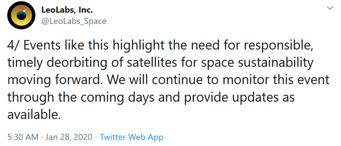 LeoLabs在Twitter上写道:“这样的事件凸显出,为了太空的可持续发展,我们需要负责任、及时地让卫星脱离轨道。我们将在未来几天继续关注这一事件并提供最新消息。”