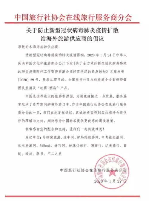 1月28日,受新型冠状病毒感染的肺炎疫情影响,中国文化和旅游部办公厅1月24日下发文件,要求从即日起,全国旅行社及在线旅游企业暂停经营团队旅游及“机票+酒店”产品。中国旅行社行业协会在线旅行服务商分会旗下马蜂窝旅游、途牛网、驴妈妈旅游网、中青旅遨游网、好巧网等10多家中国在线旅游服务商,共同向海外旅游商家发出倡议,呼吁海外商家协助各平台为中国游客提供疫情期间的保障机制,全力降低游客损失。
