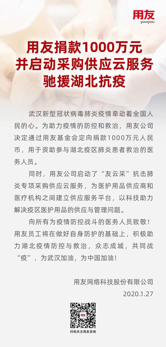 1月28日上午消息,用友公司在其公众号宣布,定向捐款1000万元,用于资助参与湖北疫区肺炎患者救治的医护人员。同时,用友启动采购供应云服务,以科技助力解决疫区医护用品的供应和管理问题。