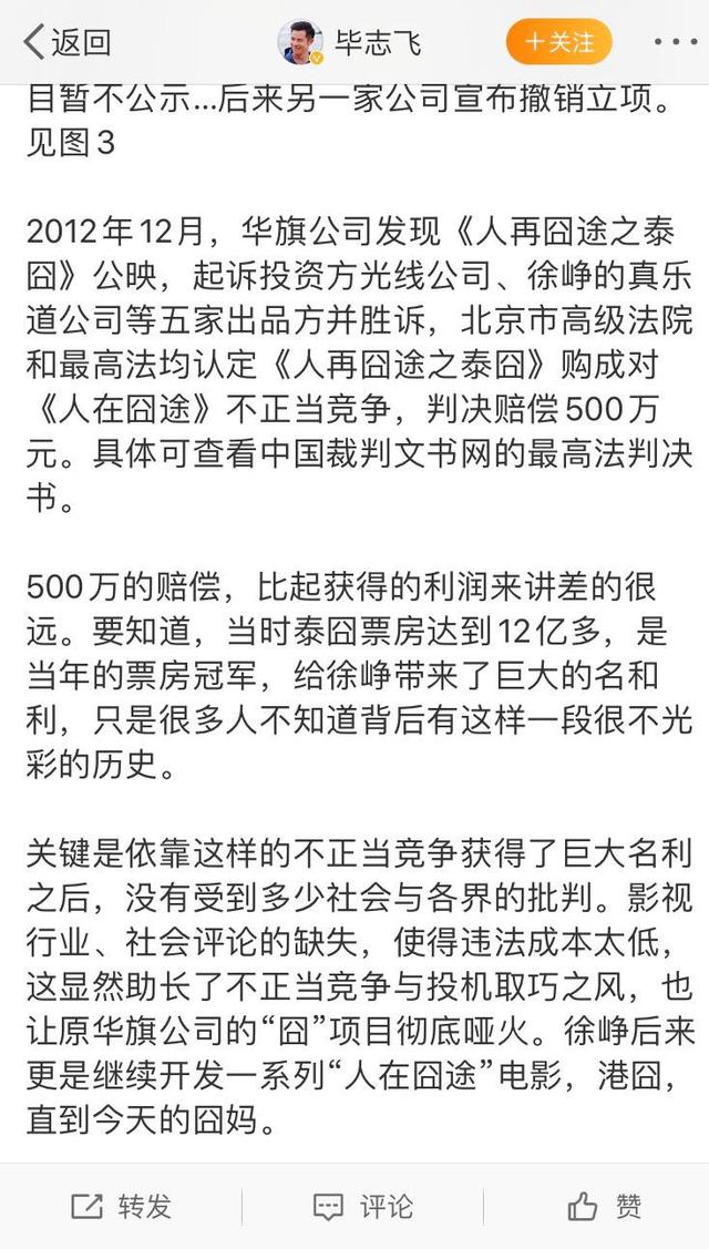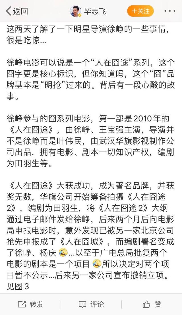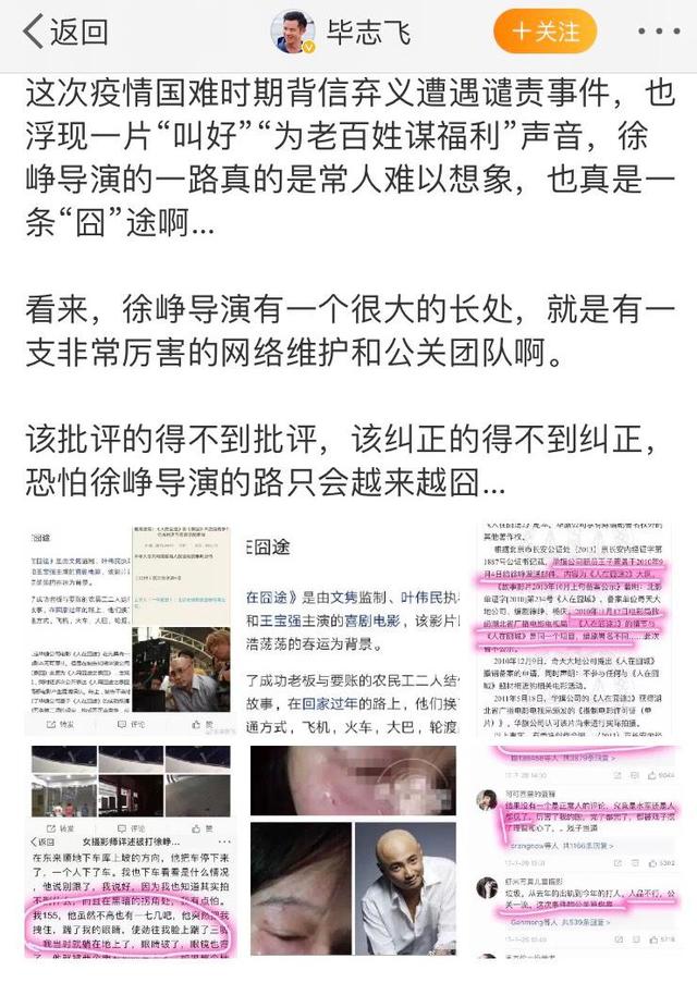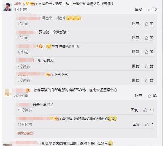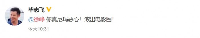 今天(1月28日)是大年初四,也是也是徐峥导演的《囧妈》在网上免费播出后的第4天,但是今天国内导演毕志飞突然发布微博并@徐峥,爆粗口骂其恶心,并让徐峥滚出电影圈。这个爆粗口的骚操作引起了很多网友在微博下面吃瓜,还以为是毕志飞被盗号了,毕志飞回应说并没有被盗号,并说在了解了一下徐峥的事情之后感觉很气愤。