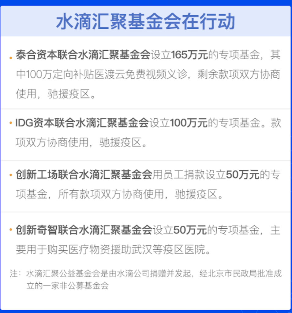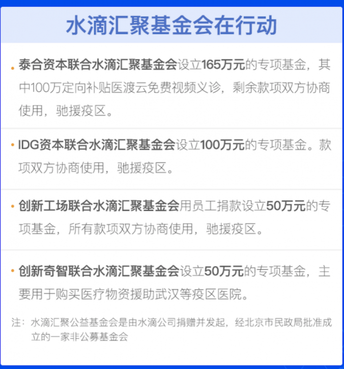 同日,泰合资本捐款165万元、IDG资本捐款100万元、创新工场员工捐款50万元和创新奇智捐款50万元,联合水滴汇聚基金会发起设立了各自的援助专项基金,所有款项与水滴共同协商,驰援疫区。
