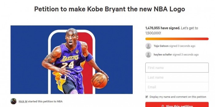 科比意外逝世,全世界球迷为之心痛。为了表达纪念,日前,有球迷在全球最大的请愿网站Change.org上发布了一则请愿,希望将NBA的Logo换成科比。这份请愿书上写道:伟大的科比·布莱恩特不幸去世,请在这份请愿书上签名,希望他能作为NBA新的Logo永垂不朽。
