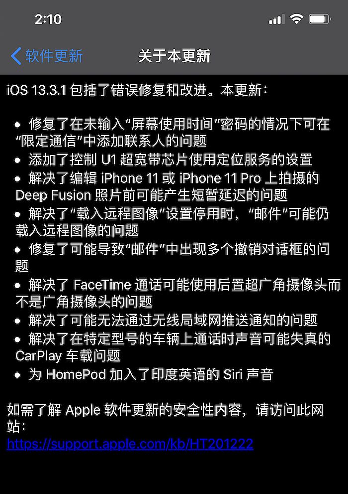 iOS 13.3.1更新内容如下: