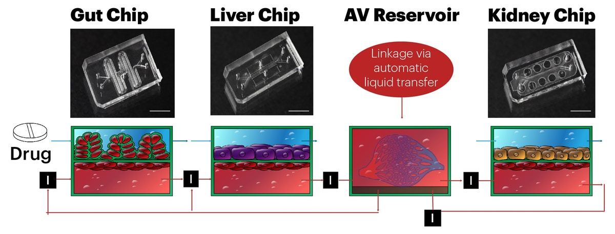 这些片上器官通过血管通道连接,这些通道在它们之间转移流体,以模拟流经人体的血液。通过这种方式,科学家可以观察药物如何影响PK和PD,并且该团队使用计算模型来预测药物如何影响整个人体。
