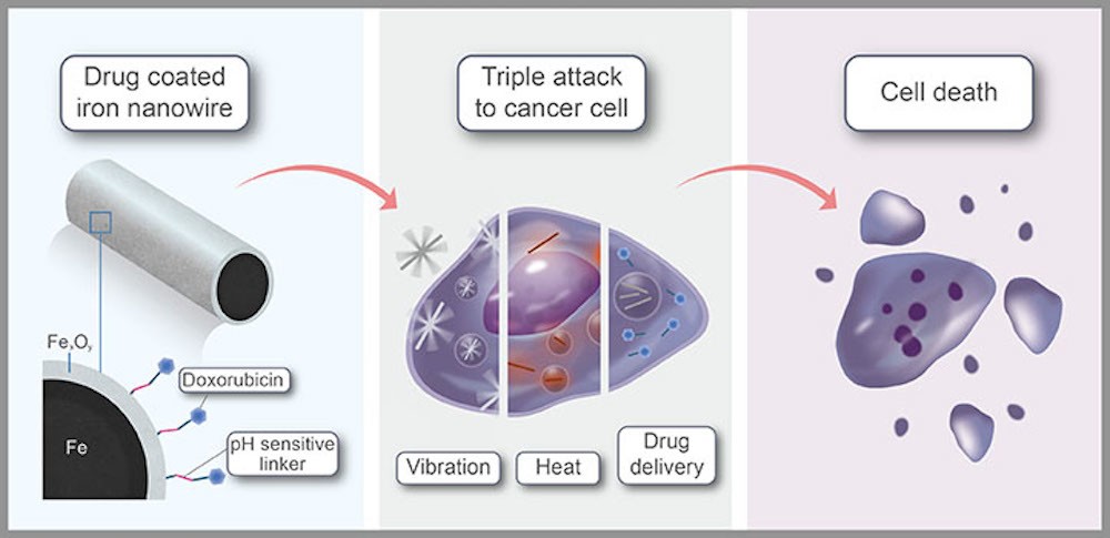 癌症是一种难以治疗的疾病,科学家正想出一些创新的方法来对抗这种疾病。现在,一项新的研究发现,铁纳米线可以同时利用热量、振动和药物对癌细胞进行三管齐下的攻击。这种纳米线的厚度仅为30至40纳米,由包裹在氧化铁壳中的铁芯制成。科学家的想法是可以将它们插入肿瘤中,然后以多种方式诱导它们攻击癌细胞。