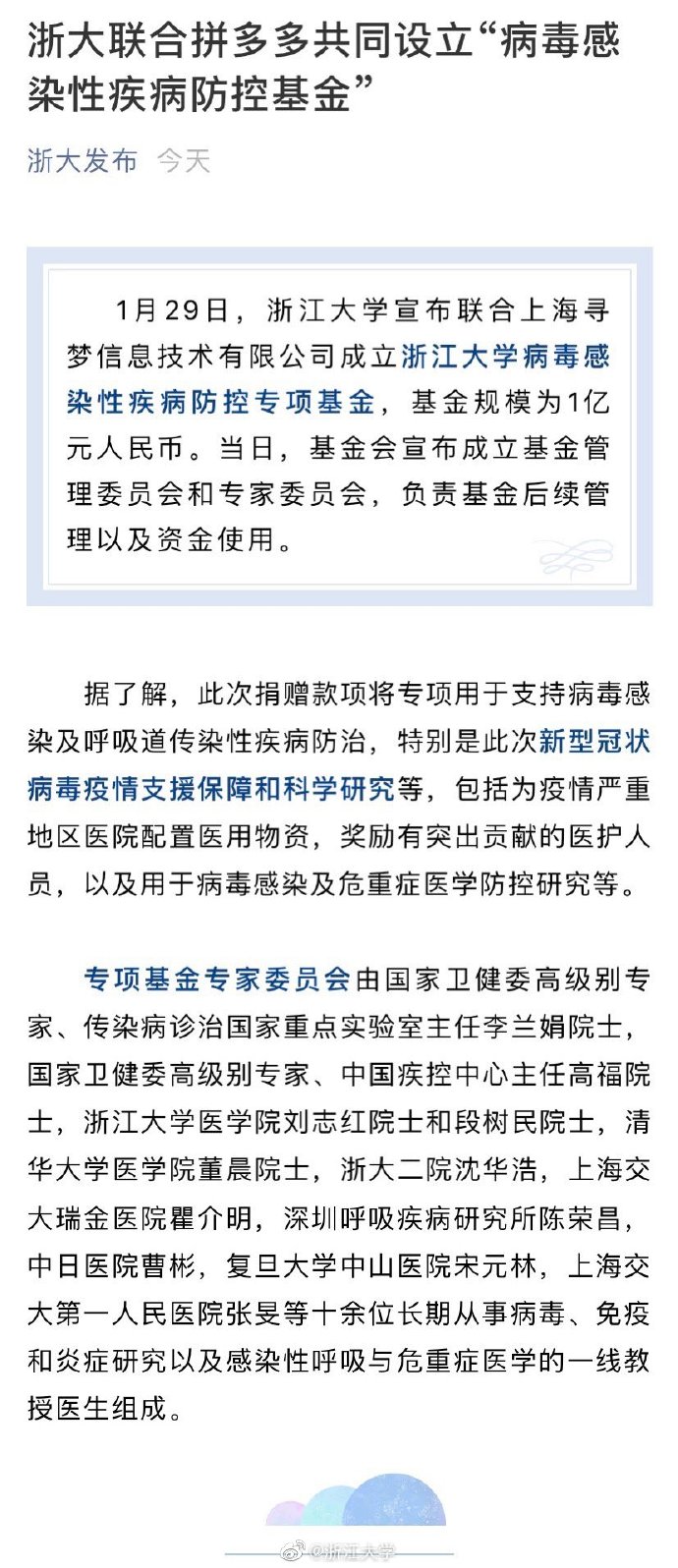 1月29日午间消息,浙江大学宣布,联合上海寻梦信息技术有限公司成立浙江大学病毒感染性疾病防控专项基金,基金规模为1亿元人民币。当日,基金会宣布成立基金管理委员会和专家委员会,负责基金后续管理以及资金使用。