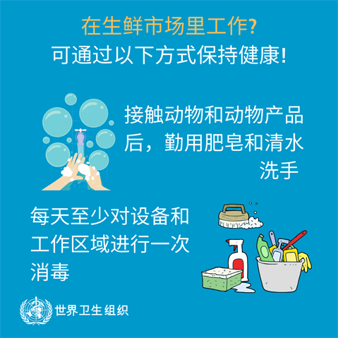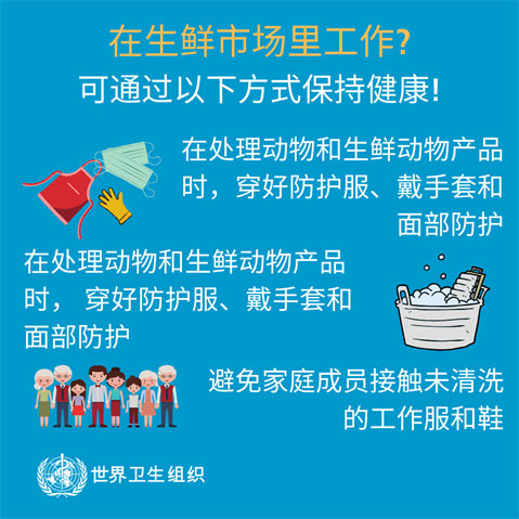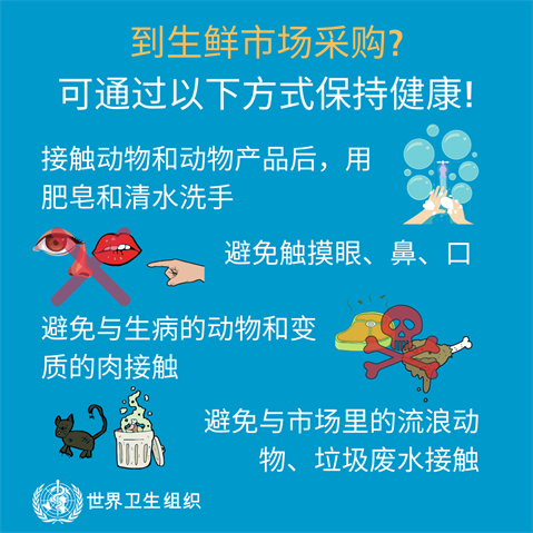 在目前存在新型冠状病毒病例地区的活体动物市场中,避免在无保护情况下直接接触活体动物以及动物触碰过的地方;