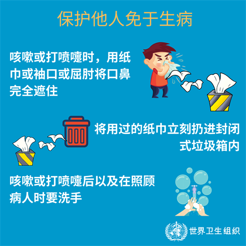 咳嗽和打喷嚏时,用弯曲的肘部或纸巾盖住口鼻,然后立即扔掉纸巾并洗手;
