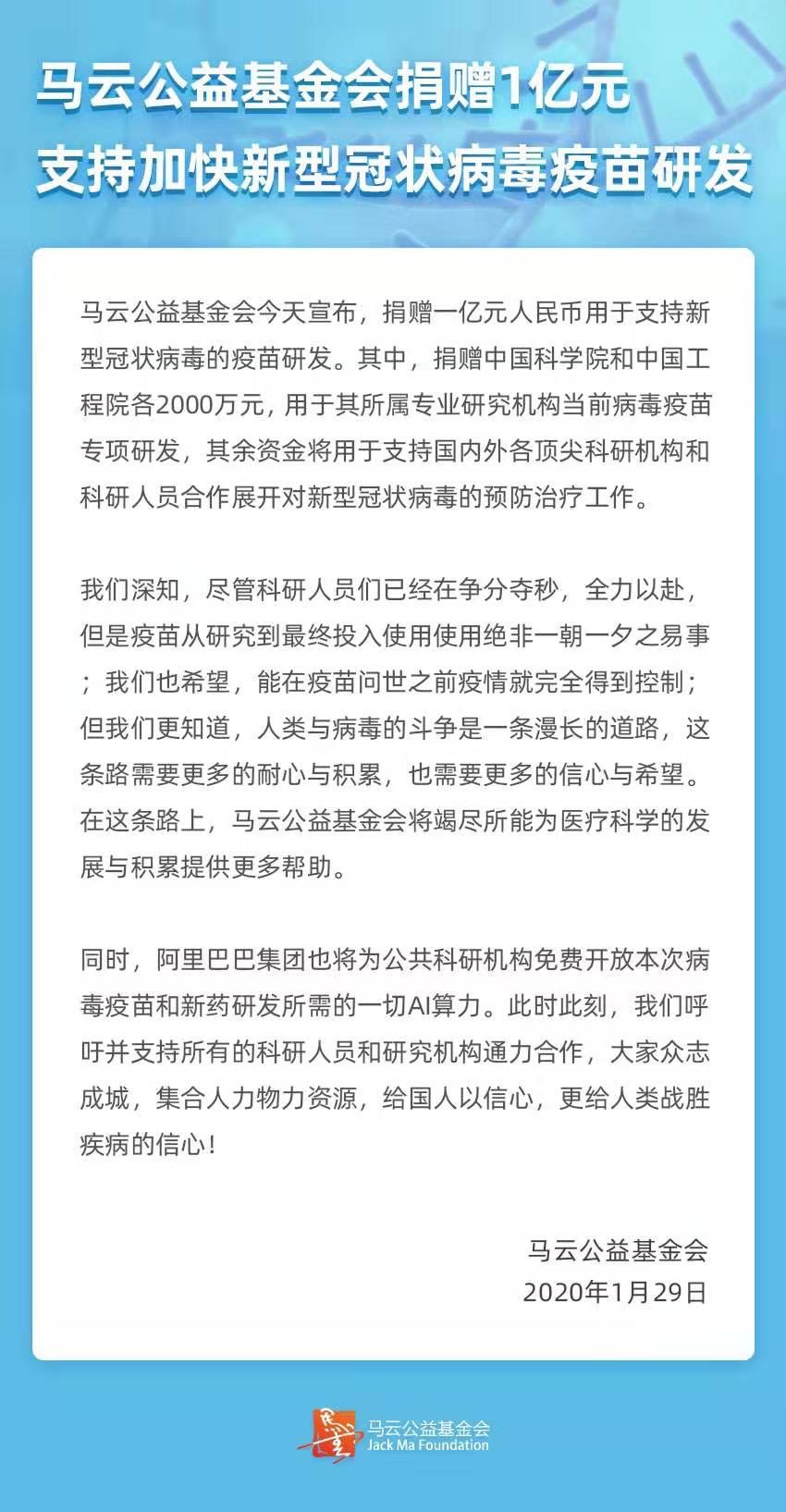 1月29日下午消息,马云公益基金会今天宣布,捐赠一亿元人民币用于支持冠状病毒的疫苗研发。其中,捐赠中国科学院和中国工程院各2000万元,用于其所属专业研究机构当前病毒疫苗专项研发,其余资金将用于支持国内外各顶尖科研机构和科研人员合作展开对新型冠状病毒的预防治疗工作。