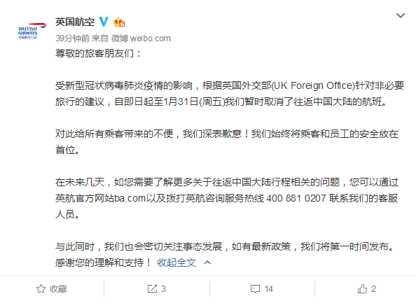 1月29日晚间,英国航空公司上海办事处官方微博宣布,受新型冠状病毒肺炎疫情的影响,自即日起至1月31日(周五),暂时取消往返中国大陆的航班。英国航空公司还表示,将会密切关注事态发展,如有最新政策,将第一时间发布。