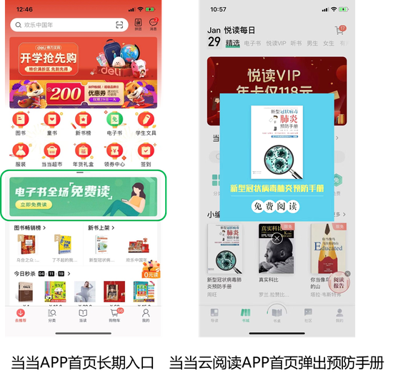 针对近期的肺炎疫情,当当网表示,每次打开当当云阅读app,会出现最新版“新型冠状病毒肺炎预防手册”弹出,提醒读者及时阅读。