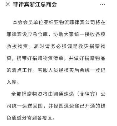 1月26日晚,在菲律宾浙江总商会的倡议下,不少在菲华人社团积极捐款捐物。菲律宾浙江总商会携手圆通速递菲律宾公司等单位为侨胞慈善义捐提供积极协助,开通救援物资运输绿色通道,为在菲各大组织、机构及个人提供救援物资免费运输。