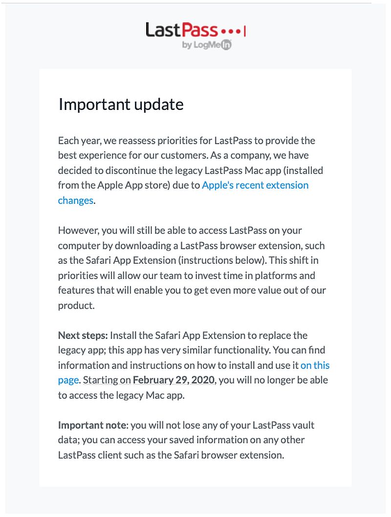 密码管理应用程序LastPass今天正式宣布,将于2020年2月29日停止对原生macOS应用程序的支持。在发送给macOS用户的电子邮件中,将引导用户切换到基于Web的全新应用程序上。 根据电子邮件,密码管理应用程序LastPass围绕着“为客户提供最佳的使用体验”这个目标而做出更改。