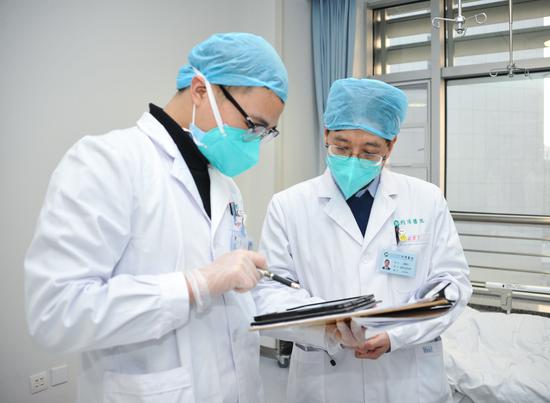 (注:图左为康复出院的卢姓患者 图右为华中科技大学同济医院呼吸与危重症医学科主任赵建平)