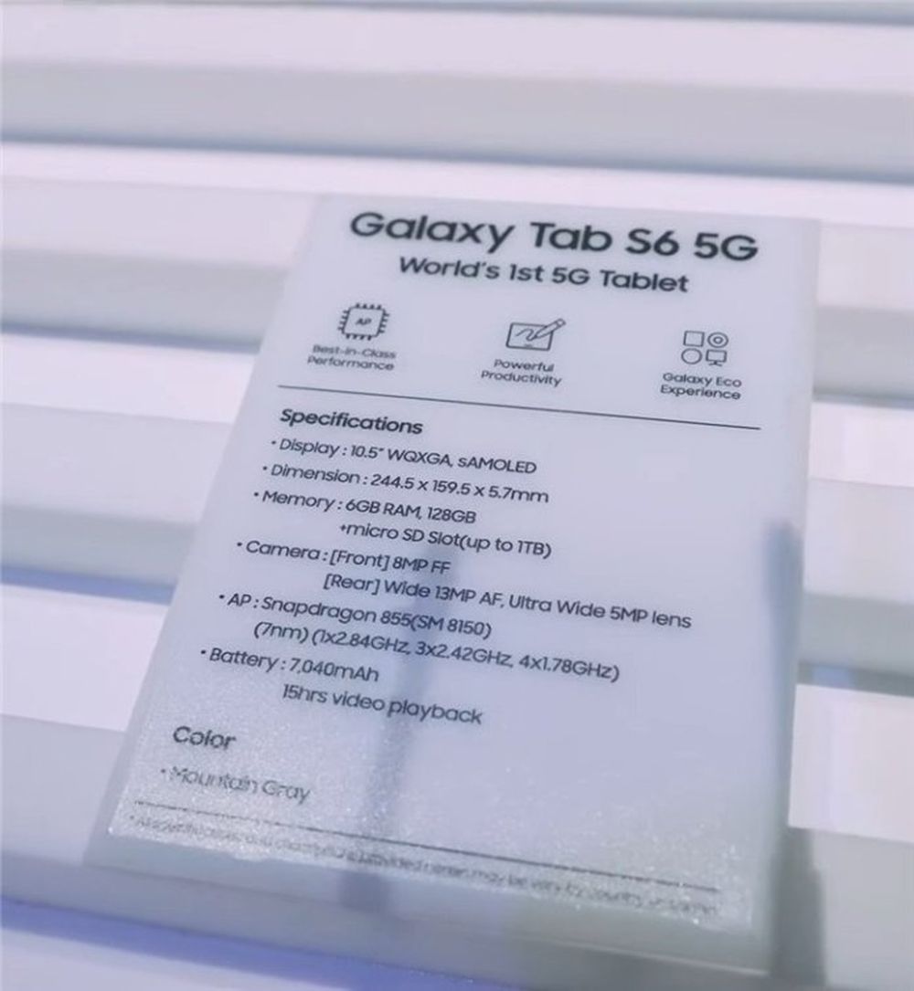 根据官方公布的规格信息,Galaxy Tab S6采用高通骁龙855处理器,提供6GB+128GB和8G+256GB两种存储选项,不过后者仅限于部分国家和地区。机身背面装备了1300万像素摄像头和500万超广角摄像头。此外该机正面装备了10.5英寸的WQXGA SAMOLED材质屏幕,机身尺寸为244.5*159.5*5.7mm,内置7040mAh容量电池,支持15小时的连续视频播放。